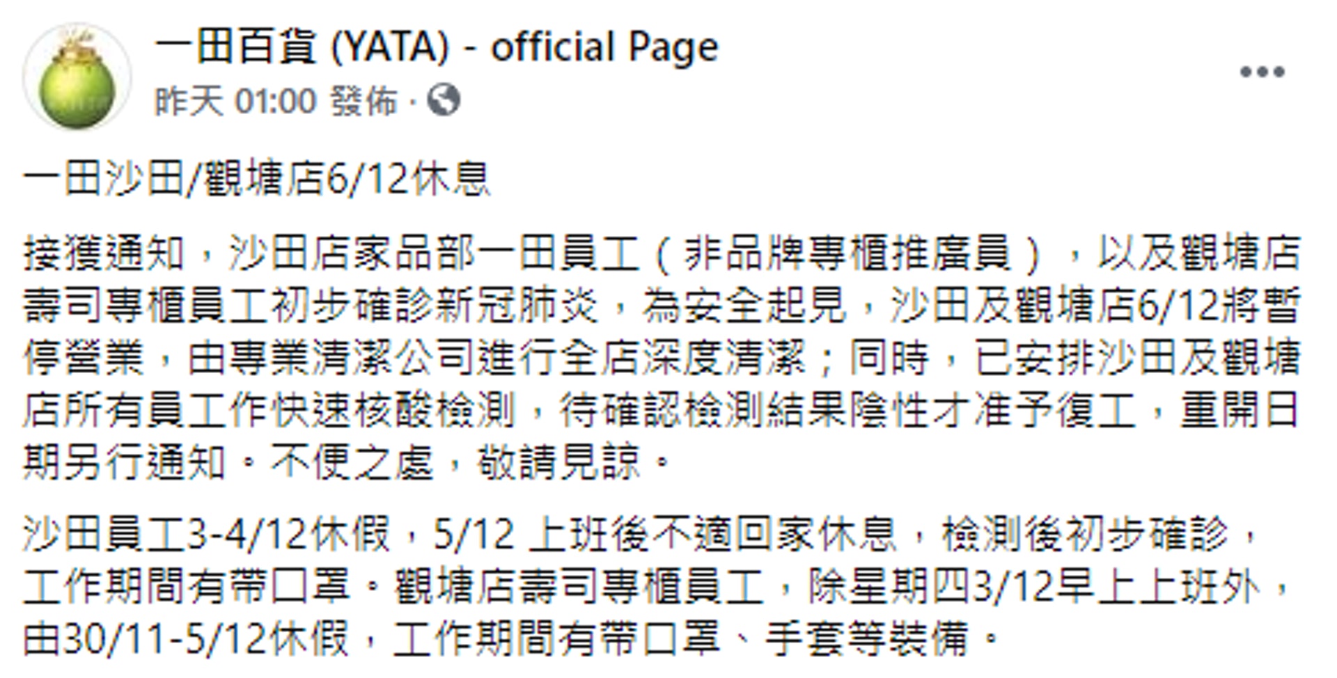 一田晚上發新聞稿指,12月5日發現沙田店員工初步確診後已安排全店進行深層清潔,沙田店全面關閉,安排所有員工接受核酸檢測。除衞生防護中心公佈沙田店5位員工初步確診外,另亦有5位員工初步確診,分別來自個別專櫃/部門,包括孖人、象印、Woll、Tommee Tippee、Clinique、超市肉部及菜部專櫃。有關分店將進行深層清潔及消毒,並暫停營業至另行通知。